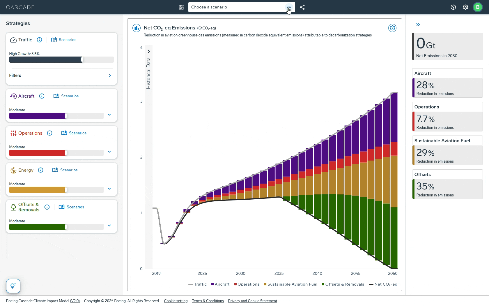 We are excited to launch a new version of the Boeing Cascade Climate Impact Model—Cascade 2.0—focused on helping you leverage credible data to explore foundational topics in aviation sustainability and answer the industry’s most pressing questions. This latest version is our most powerful yet, offering a dynamic way to analyze aviation’s path to net-zero emissions.